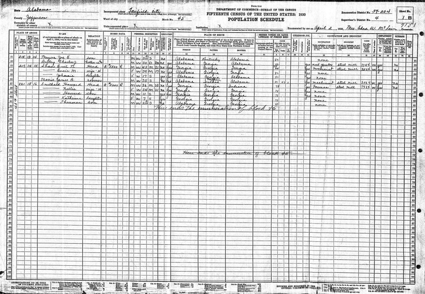 Census: 1930 at: Fairfield, Jefferson Co., AL Census Image Occupation listed as a Steel Mill Foreman