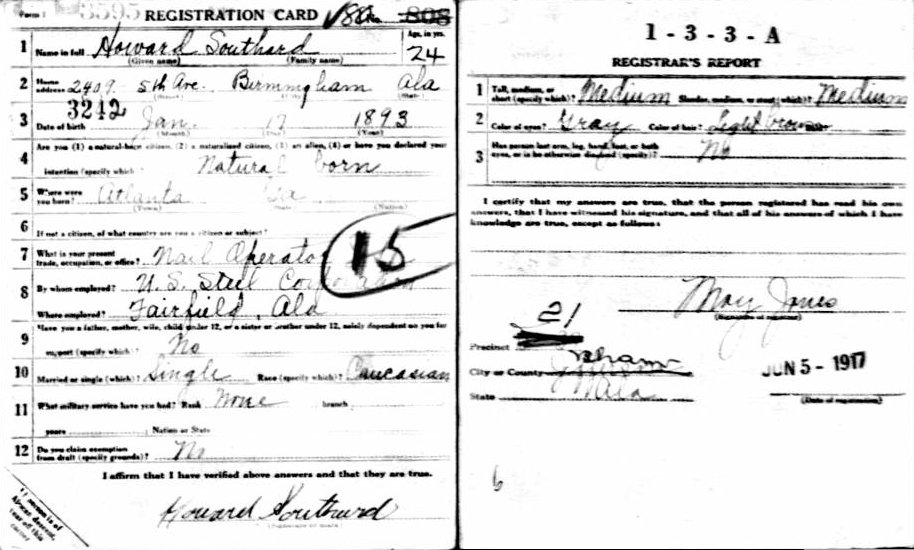 Military: 5 June 1917 at: Birmingham, AL WWI Draft Card