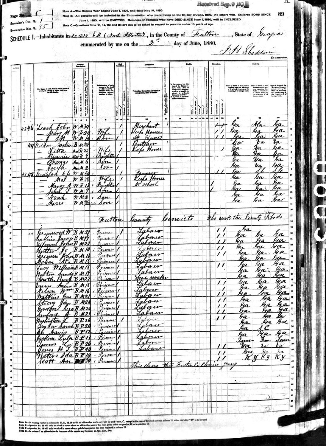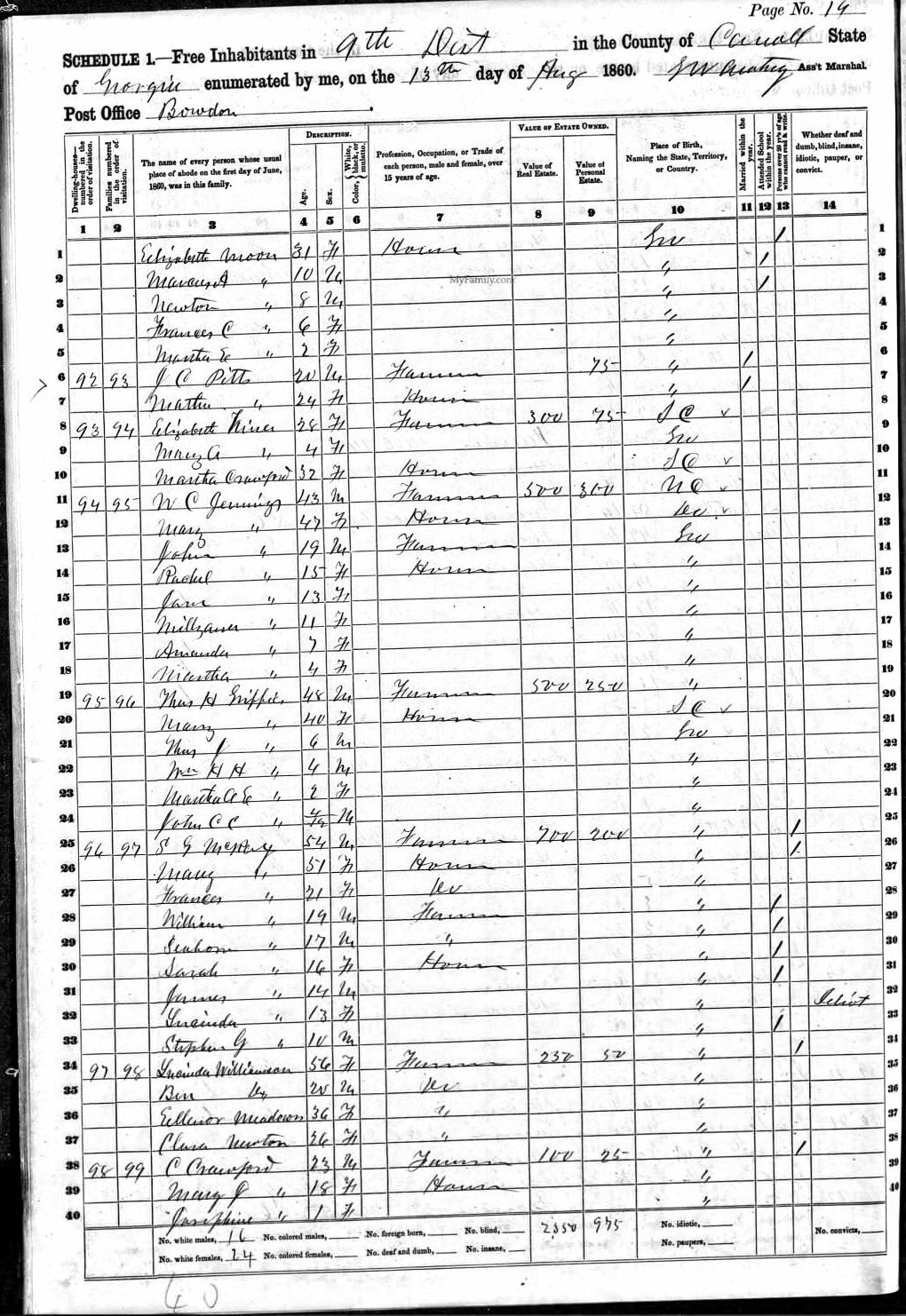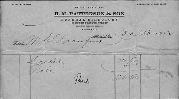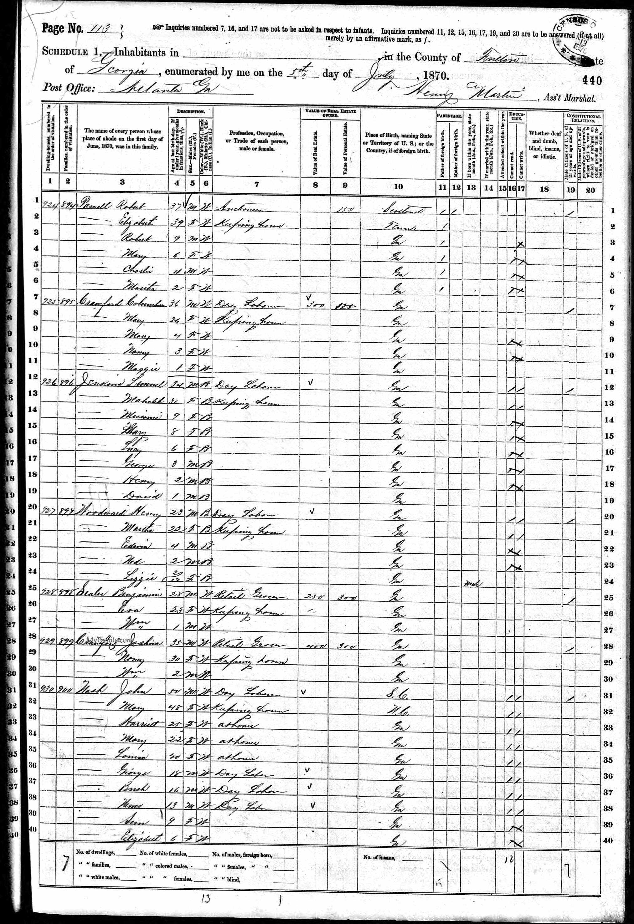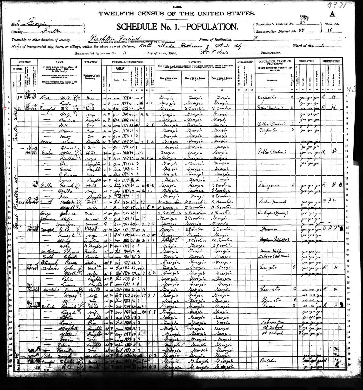 Christopher Columbus CRAWFORD Born: JAN 1828 at: Georgia Married: 18 April 1858 at: Carroll Co, GA Census: 1860 at: Carroll Co, GA (Census Image) Military: Confederate in: Co. C, 26th Battalion Georgia Infantry Census: 1870 at: Atlanta, Fulton Co, GA (Census Image) Census: 1880 at: North Atlanta, Fulton Co, GA (Census Image) Census: 1900 at: Peachtree, Fulton Co, GA (Census Image) Pension: 7 Aug 1901 at: Fulton Co., GA Confederate Pension Application Died: 5 JAN 1912 at: Atlanta, GA Receipt: 1912 at: Atlanta, AL (Funeral Home receipt) Father: Jesse CRAWFORD (not confirmed) Mother: Unknown