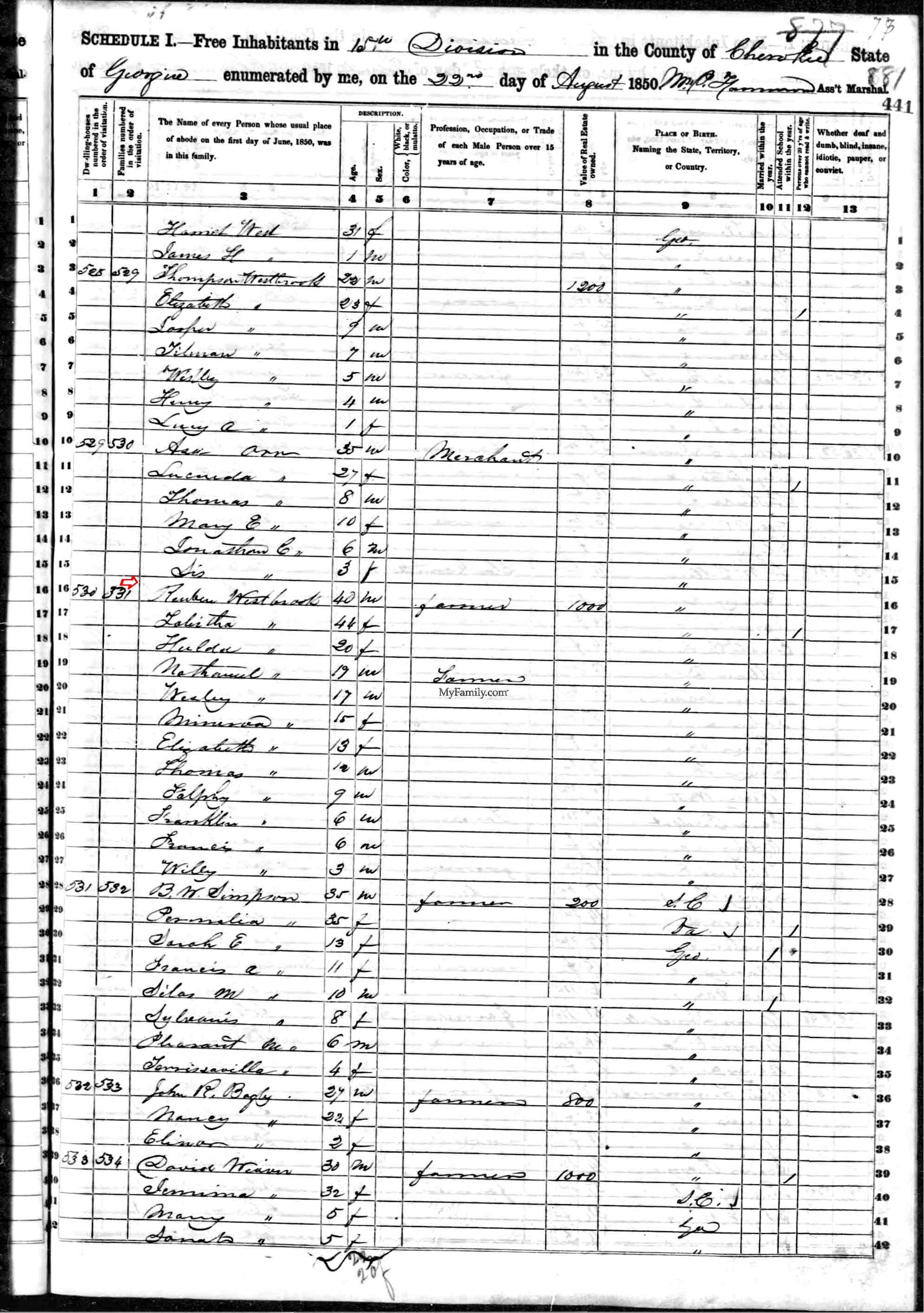 Reuben WESTBROOKS Born: 15 NOV 1809 at: Franklin Co., GA Married: 4 Dec 1828 at: Census: 1850 at: Cherokee Co., GA Census Image Census: 1860 at: Cherokee Co., GA Census Image Page one Census Image Page two Died: 1870 at: Cherokee Co., GA Father: Mother: