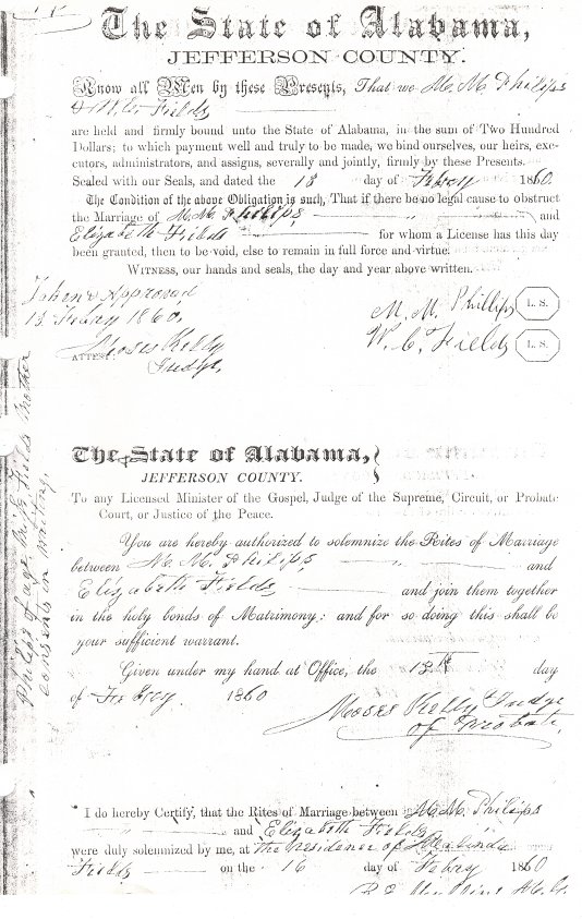 Martin Marion PHILLIPS Born: 4 JAN 1831 at: Walker County, AL Married: 16 FEB 1860 at: Jefferson County, AL Marriage Certificate Census: 1860 at: Walker County, AL Census Image Military: 6 SEPT 1862 at: Walker County, AL into Co. B, 13th Battalion, Ala CMSR Military: 1863 at: Northern Mississippi, 13th Battalion reorganized into Co. F, 56th Reg Ala under the command of Elijah Rice. Register: 1867 at: Precinet 10, Walker Co., AL 1867 Voter's Registration List Census: 1880 at: Walker County, AL Download Census Image Probate: 1885 at: Jefferson Co., AL - named with Elizabeth Jane Fields as heir to John Fields Census: 1900 at: Walker county, AL Download Census Image Died: 5 FEB 1905 at: Walker County, AL Burial: Phillips Family Cemetery, Empire, Walker Co., AL Father: Jefferson Jake PHILLIPS Mother: Mary HENSON Note: In 1906 a pension application was filed by Martin Marion Phillips' second wife, Mary E. Weldon Guthrie Phillips. Download pension file Marion and Mary married 23 Oct 1901.