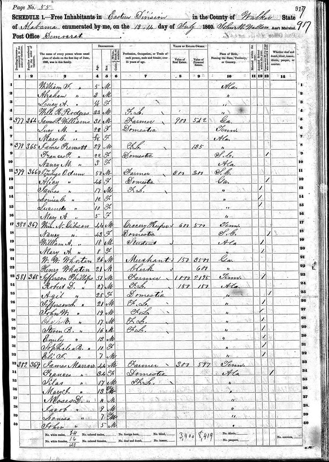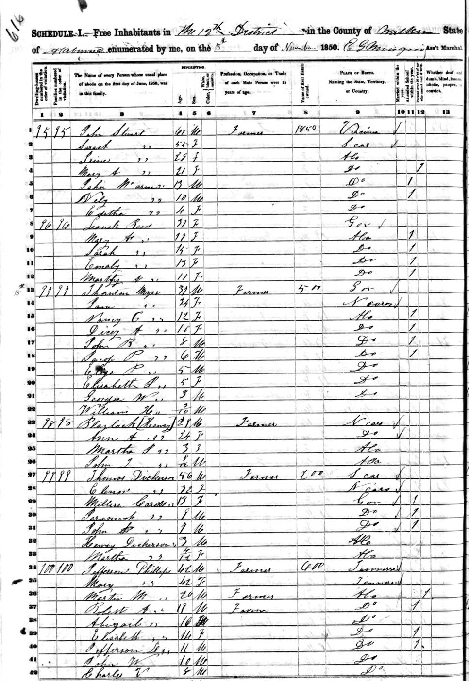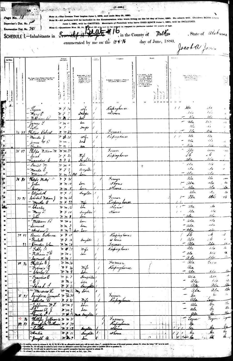 Jefferson PHILLIPS Born: 1808 at: Anderson, TN Married: 1829 at: Military: Alabama Militia, Indian Wars Census: 1850 at: Walker Co., AL (Census Image page one) (Census Image page two) Census: 1860 at: Walker Co., AL (Census Image) Census: 1880 at: Beat 16, Walker Co., AL (Census Image) Died: 1892 at: Burial: Assumed buried at Rocky Hollow Cemetery, Empire, Walker Co., AL Marker: Phillips Freewill Cemetery, Dilworth, Walker Co., AL Father: Robert Burton PHILLIPS Mother: Abigail ADKINS