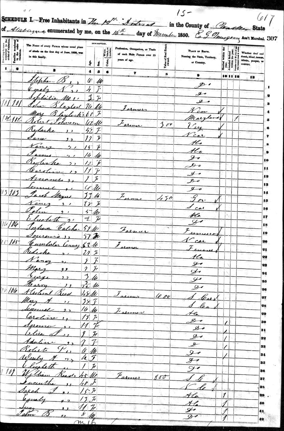 Mary HENSON Born: 1810 at: TN Census: 1850 at: Walker Co., AL (Census Image page one) (Census Image page two) Died: Bef 1860 at: Father: Mother: