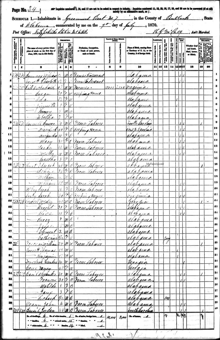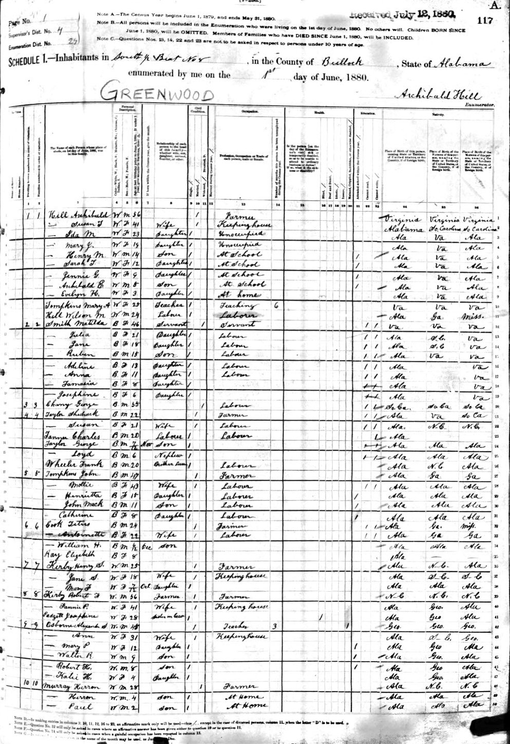 Archibald HILL Born: 19 OCT 1824 at: Virginia Married: 24 MAY 1856 at: Montgomery Co., AL Census: 1870 at: Fitzpatrick, Bullock Co., AL (Download Census Image) Occupation listed as Farmer Census: 1880 at: Greenwood, Bullock Co., AL (Download Census Image) Occupation listed as Farmer and also Census Enumerator Died: 25 MAY 1894 at: Father: Henry HILL Mother: Sallie WOOLFOLK
