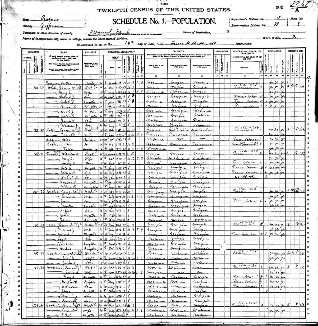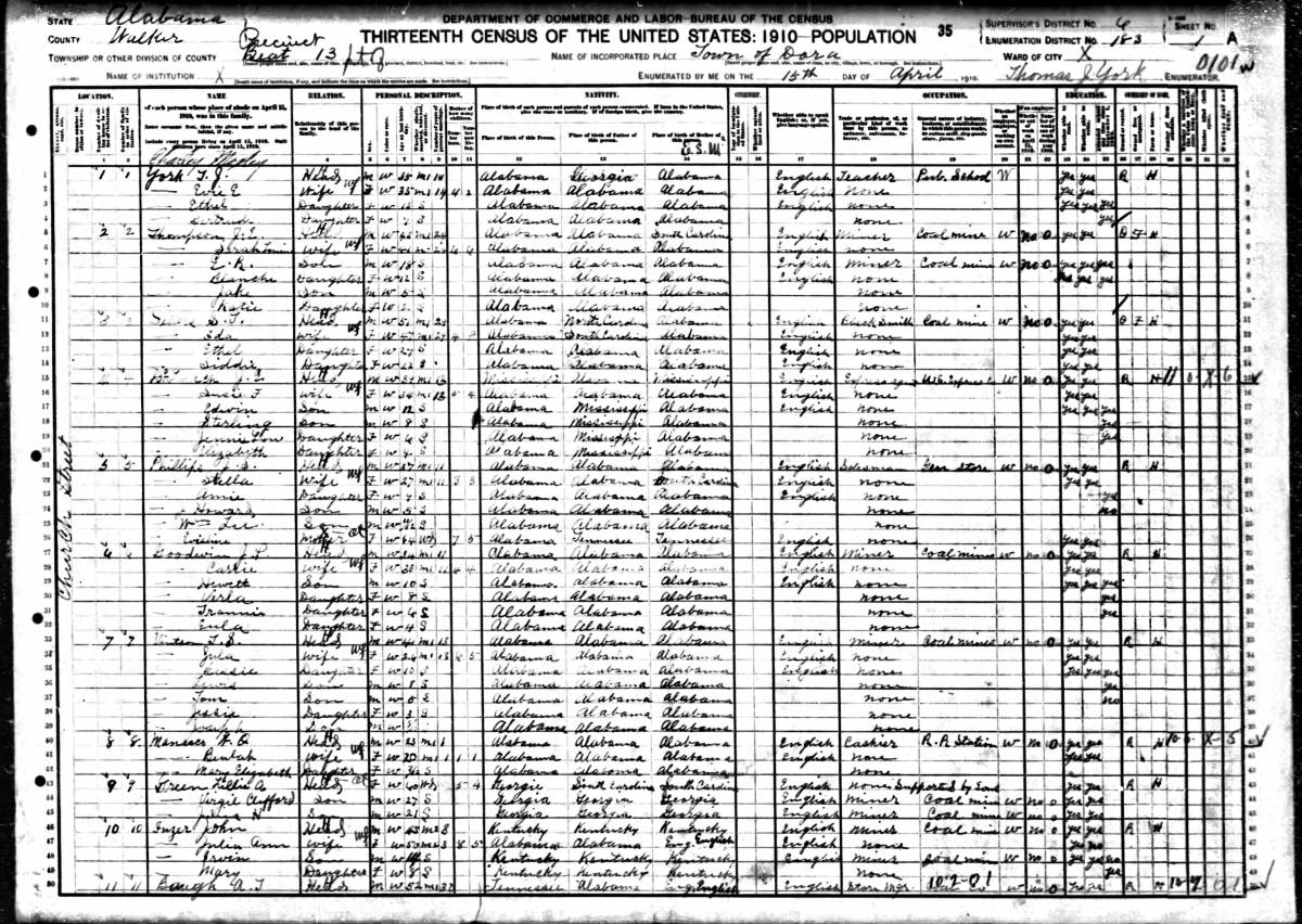 James Perry GOODWIN Born: 29 SEP 1876 at: Alabama Married: Abt 1898 at: Census: 1900 at: Jefferson Co., AL (Census Image) Census: 1910 at: Walker Co., AL (Census Image) Died: 24 OCT 1913 in: Sayre Mine Explosion, Brookside, Jefferson Co., AL Burial: Phillips Family Cemetery, Empire, Walker Co., AL Father: Pinkey E. GOODWIN Mother: Martha Ann NAIL