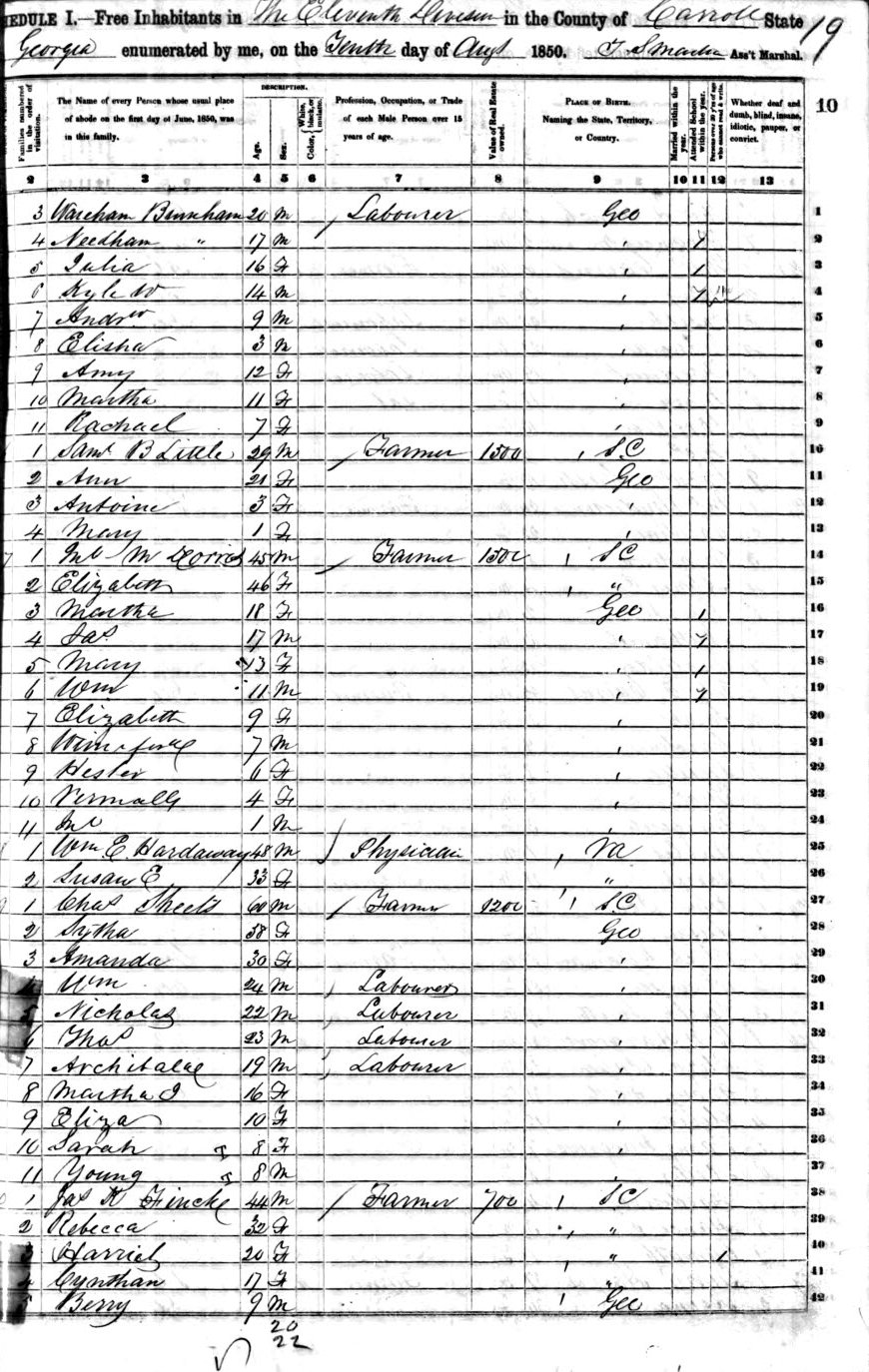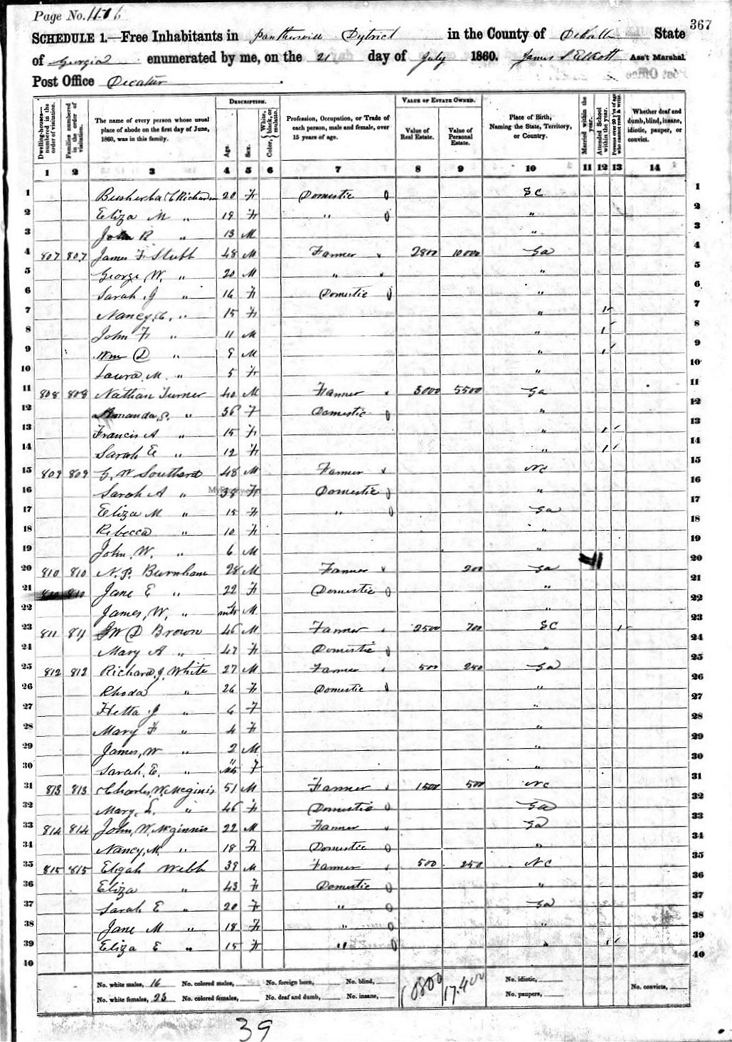Needham Palmer BURNHAM Born: 30 Sep 1831 at: Census: 1850 at: Carroll Co., GA (with parents) Census Image Page 2 Census: 1860 at: Panthersville District, Dekalb Co., GA. Census Image Military: 15 May 1862 at: Fulton Co., GA, Co. E, GA 56th Infantry, Confederate Army Married: 24 Dec 1857 at: Died: 18 Jun 1863 at: Died during the Battle of Vicksburg, MS Father: Elisha BURNHAM Mother: Mary UNKNOWN