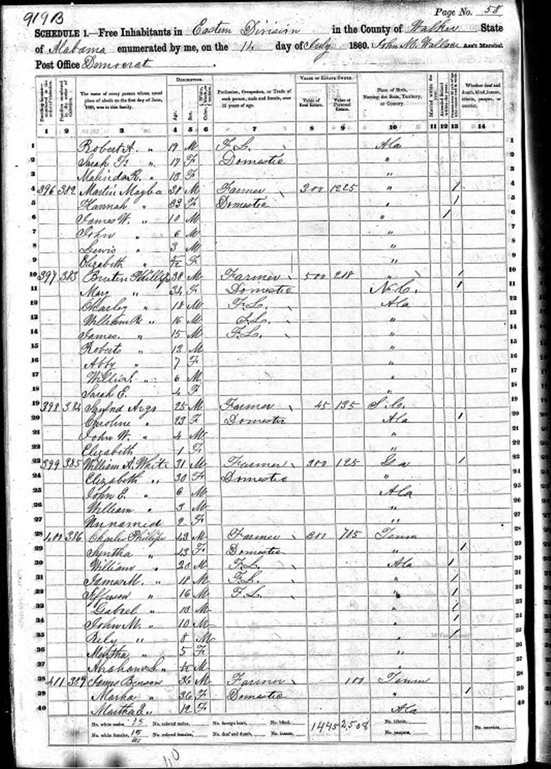 Charles Alvie PHILLIPS Born: 15 April 1812 at: Bledsoe Co., TN Married: 1838 at: Census: 1860 at: Walker Co., AL (Census Image) Register: 1867 at: Walker Co., AL (1867 Voter's Registration List (pdf)) Died: 1880 at: Sumiton, Walker Co., AL Father: Robert Burton PHILLIPS Mother: Abigail ADKINS