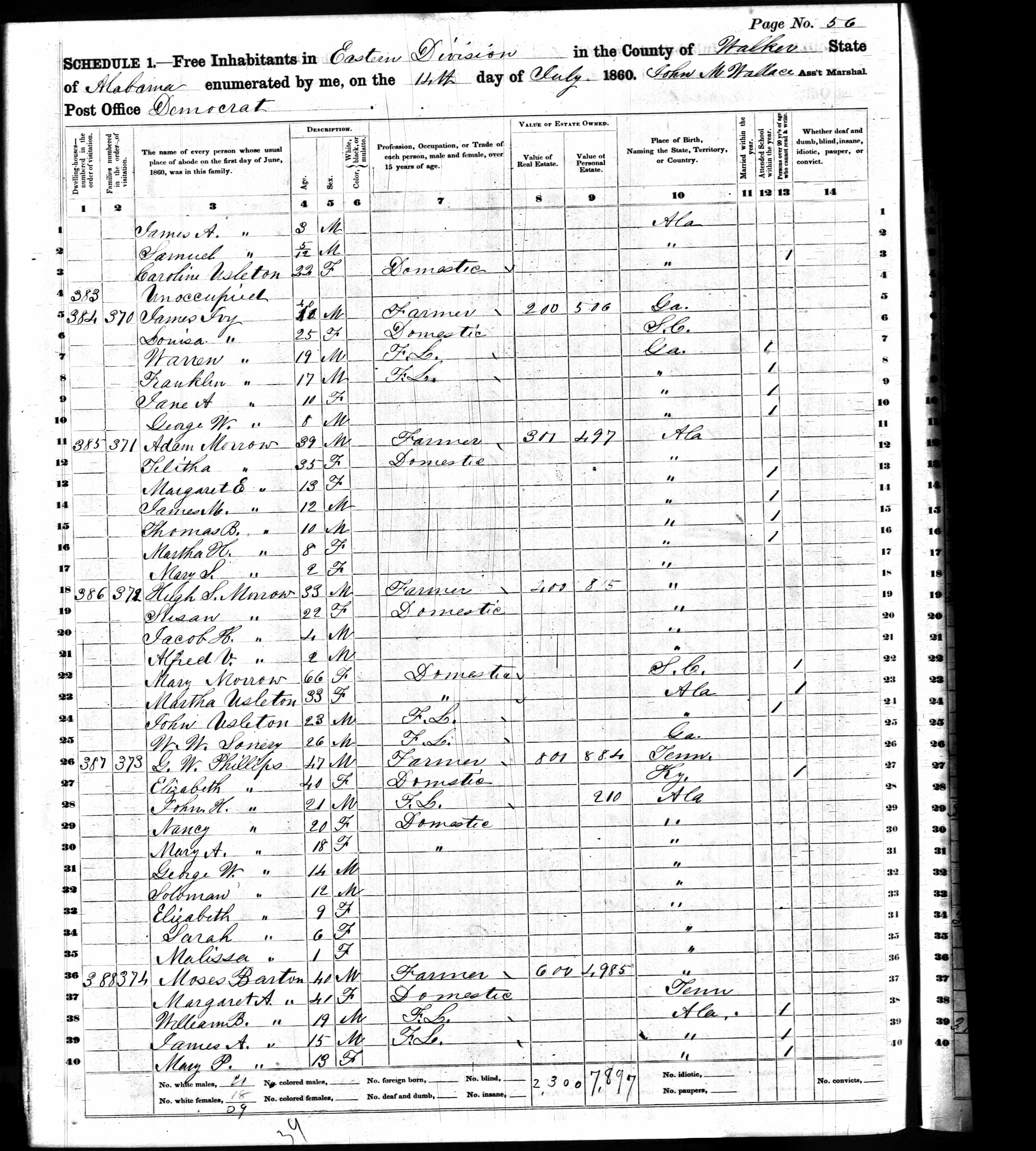 Census: 1860 at: Eastern Division, Walker Co., AL Census Image
