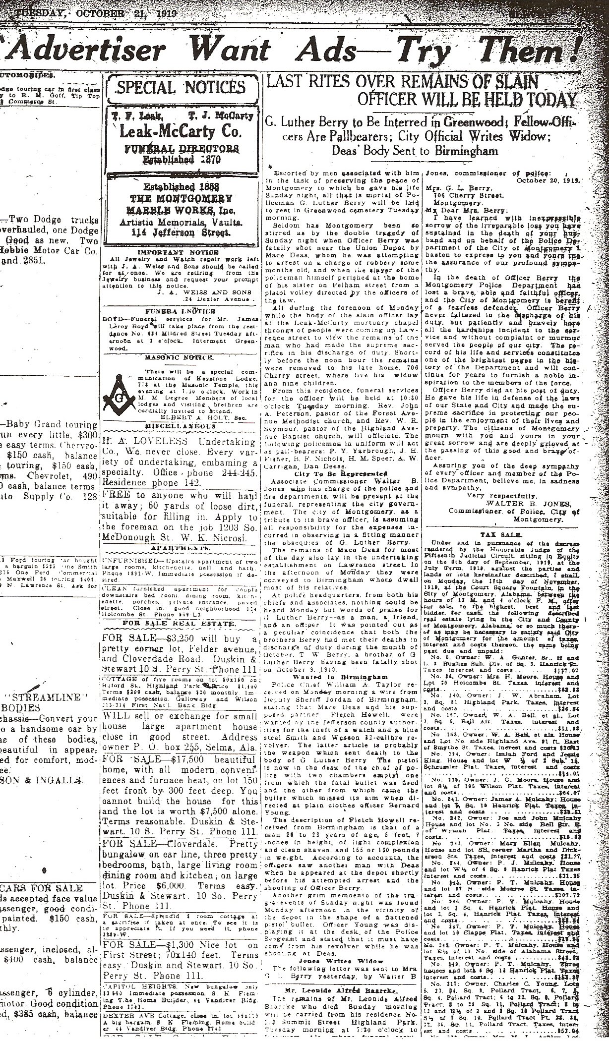 Note: George Luther Berrey was a Montgomery Police Officer and was killed in the line of duty.