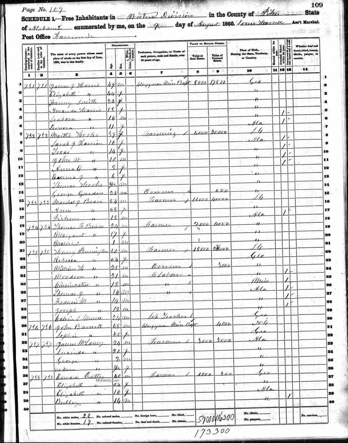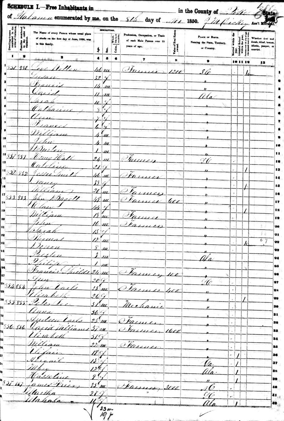 James FARRIOR Born: Abt 1815 at: North Carolina Married: Dec 15, 1837 at: Pike Co., AL Census: 1850 at: Pike Co., AL (as "Frier") Census Image Census Image Page two Died: Bef 1858 at: Father: Mother:
