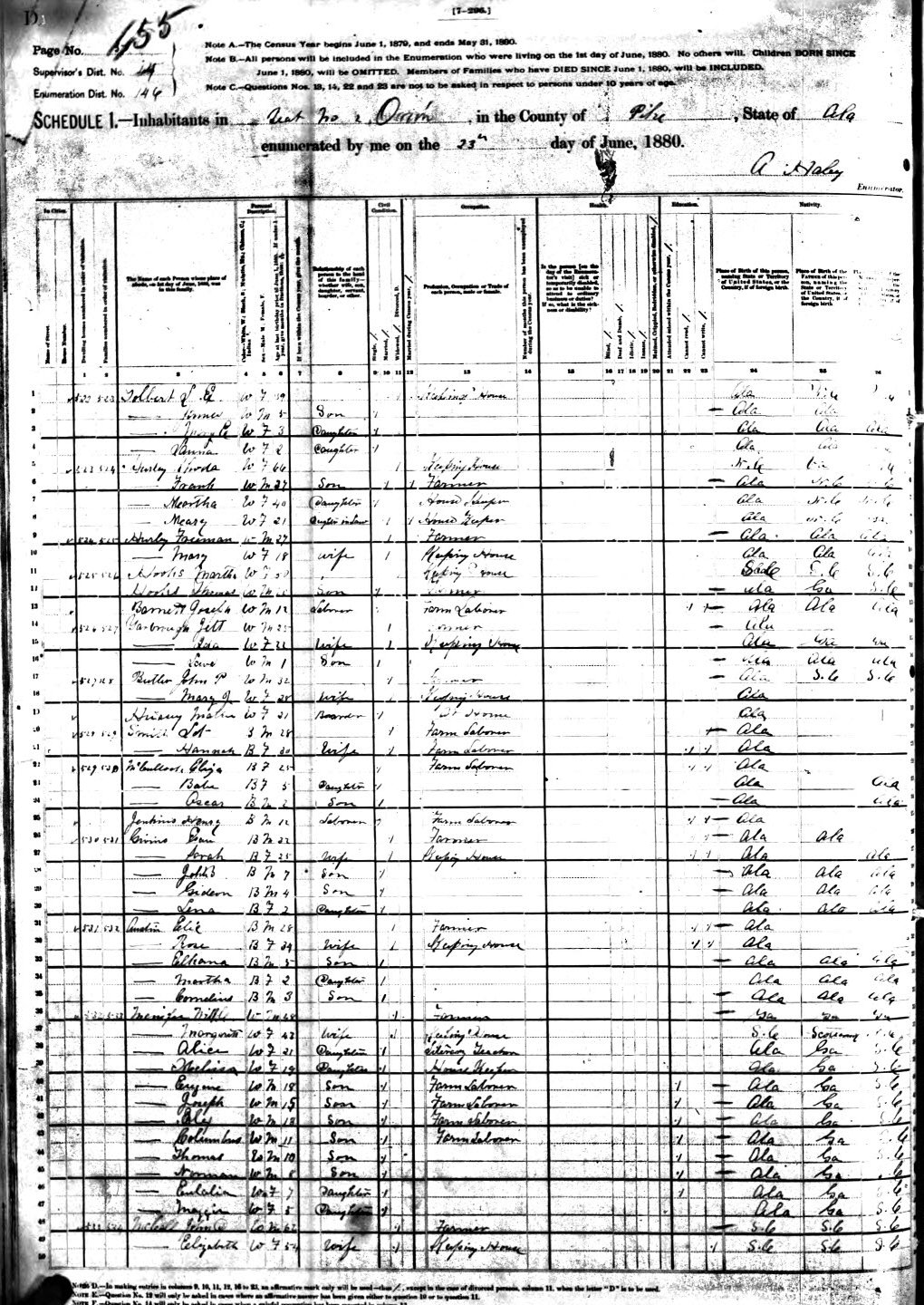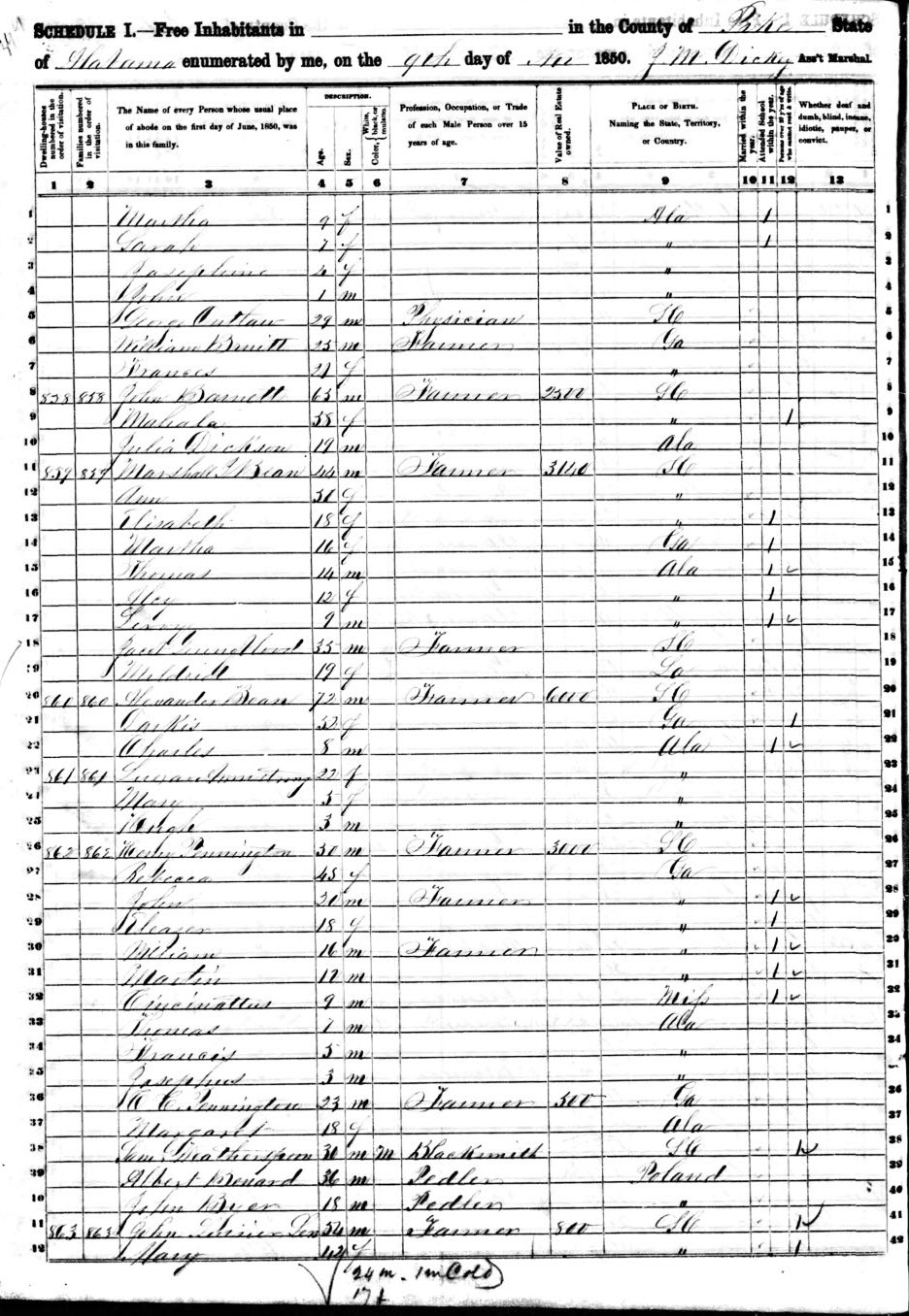 Martha BARNETT Born: Abt 1821 at: South Carolina Census: 1850 at: Pike Co., AL (as "Frier") Census Image Census Image Page two Census: 1860 at: Western Division, Pike Co., AL Census Image Census: 1870 at: Beat 2, Orion, Pike Co., AL Census Image Census: 1880 at: Orion, Pike Co., AL Census Image Died: Father: John BARNETT Mother: Mahala MOTHERSHED Other Spouse: Thomas J. HOOKS (m. 8 Jul 1858)