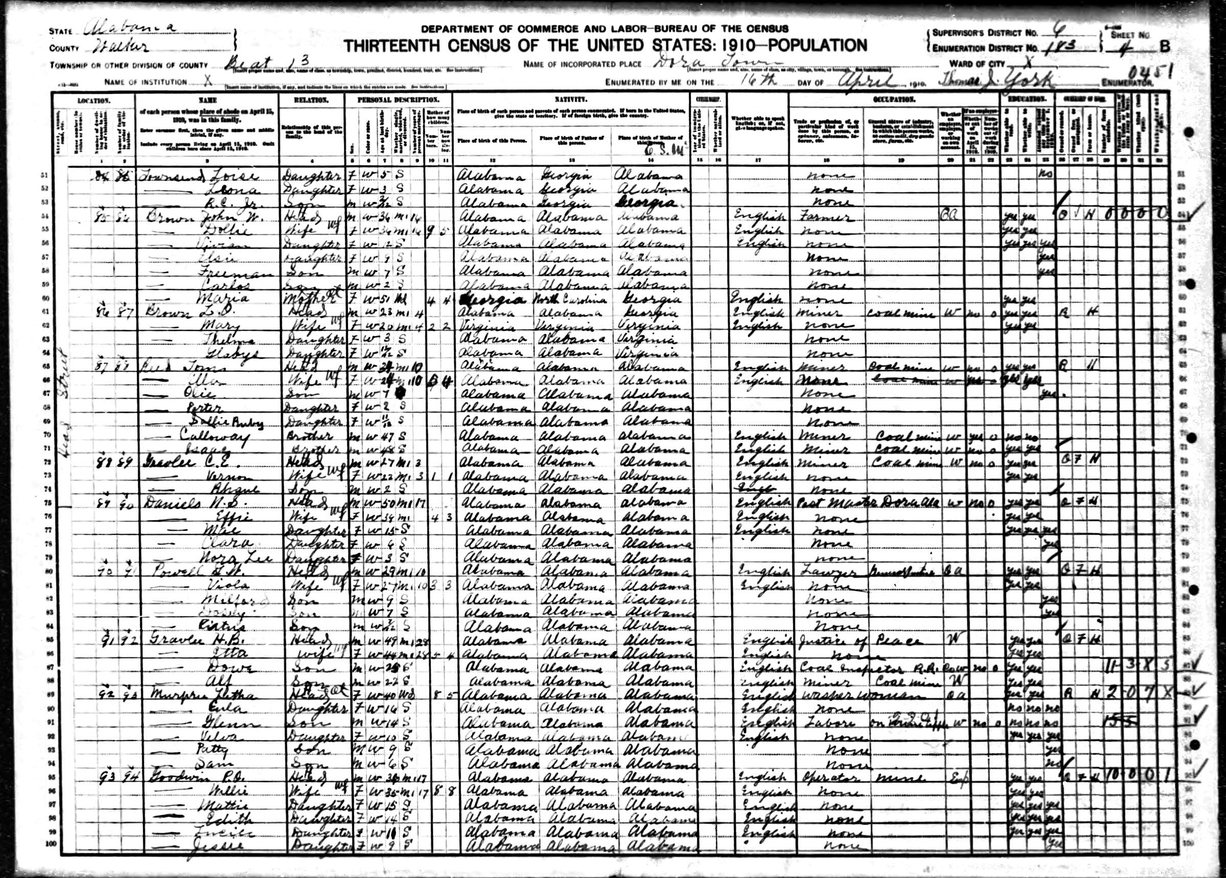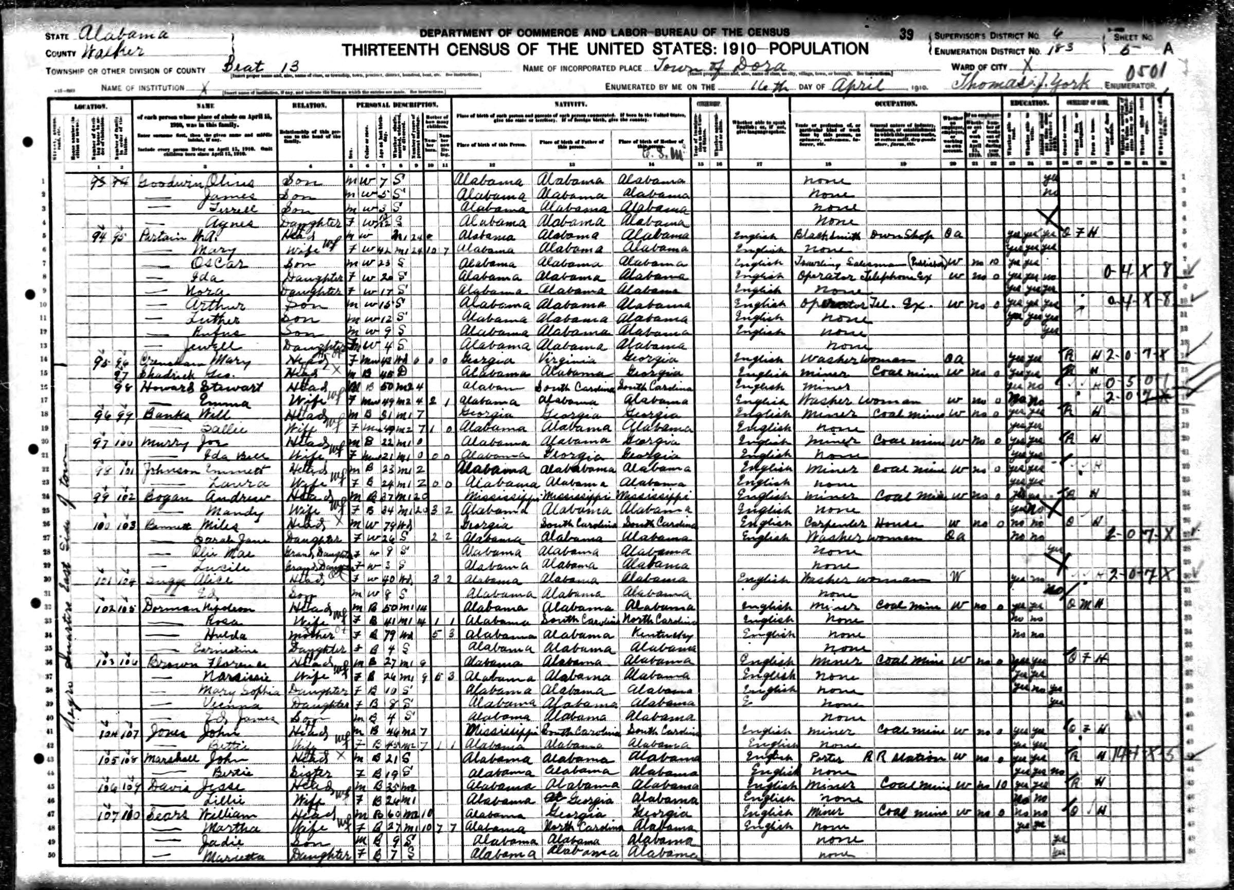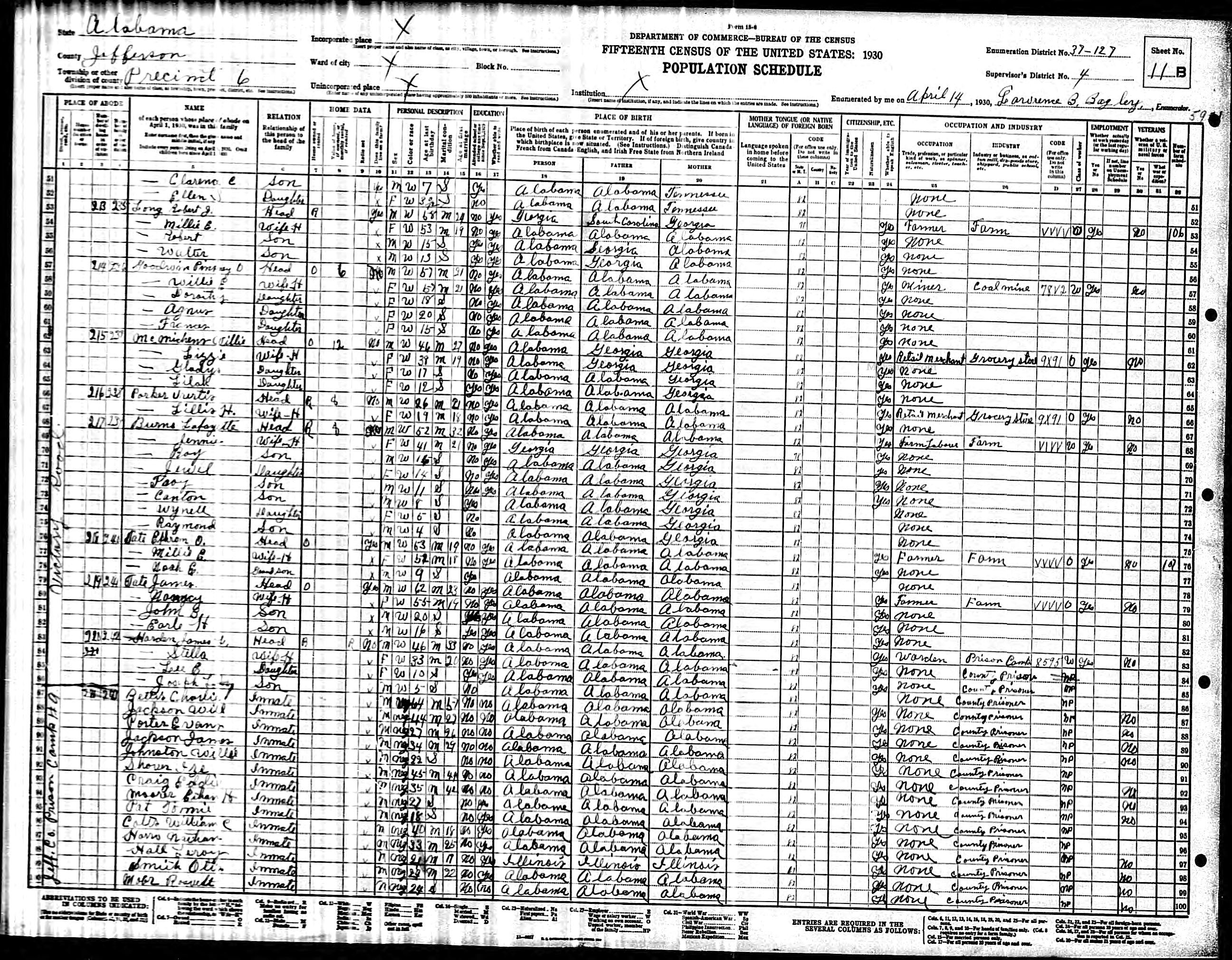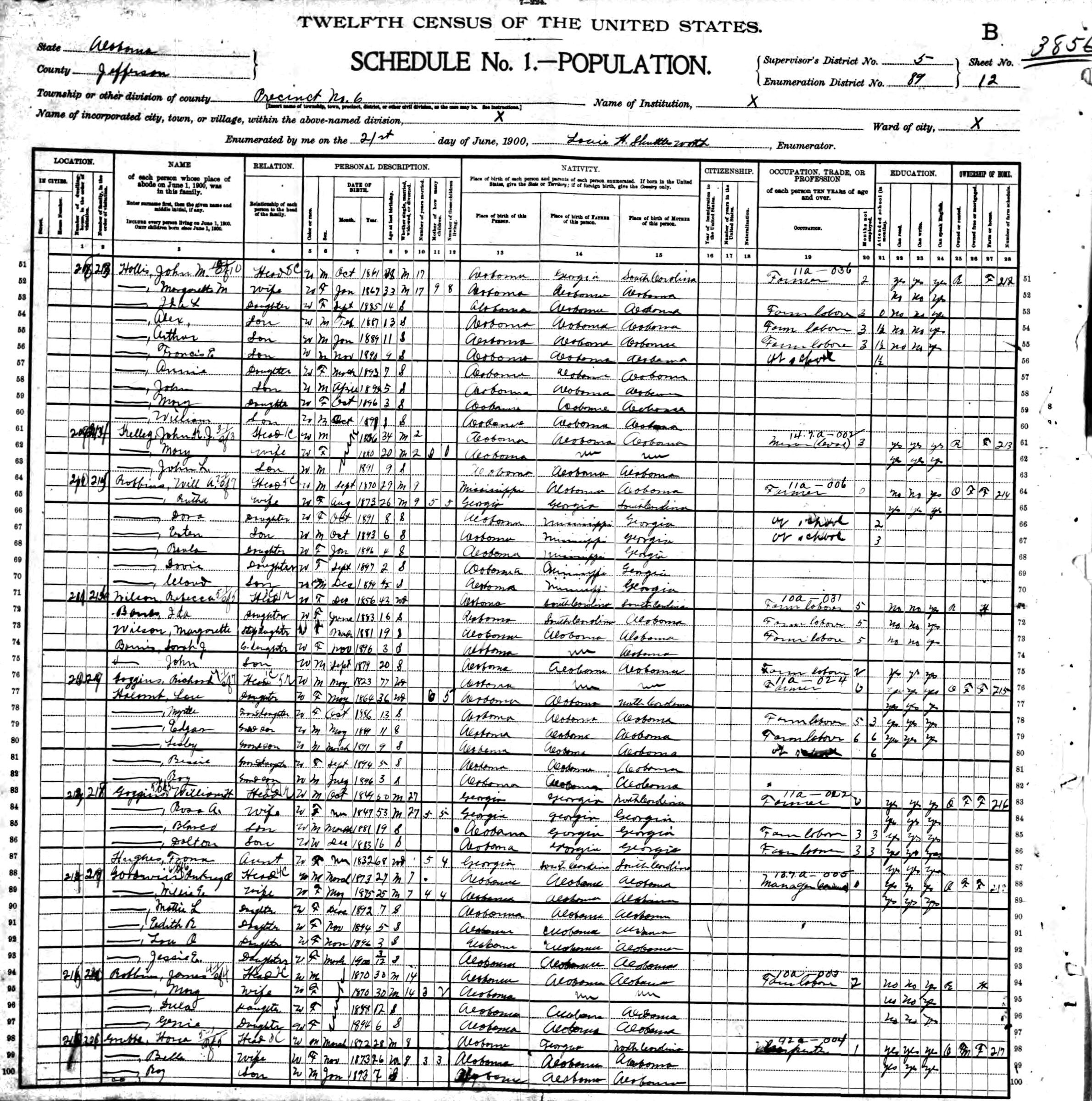 Willie Elizabeth UKNOWN Born: May 1875 at: Alabama Census: 1900 at: Precient 6, Jefferson Co., AL (Census Image) Census: 1910 at: Precient 13, Walker Co., AL (Census Image page one Page 2) Census: 1920 at: Townley, Walker Co., AL (Census Image) Census: 1930 at: Precient 6, Jefferson Co., AL (Census Image) Died: 23 Oct 1954 at: Jefferson Co., AL Father: Mother: