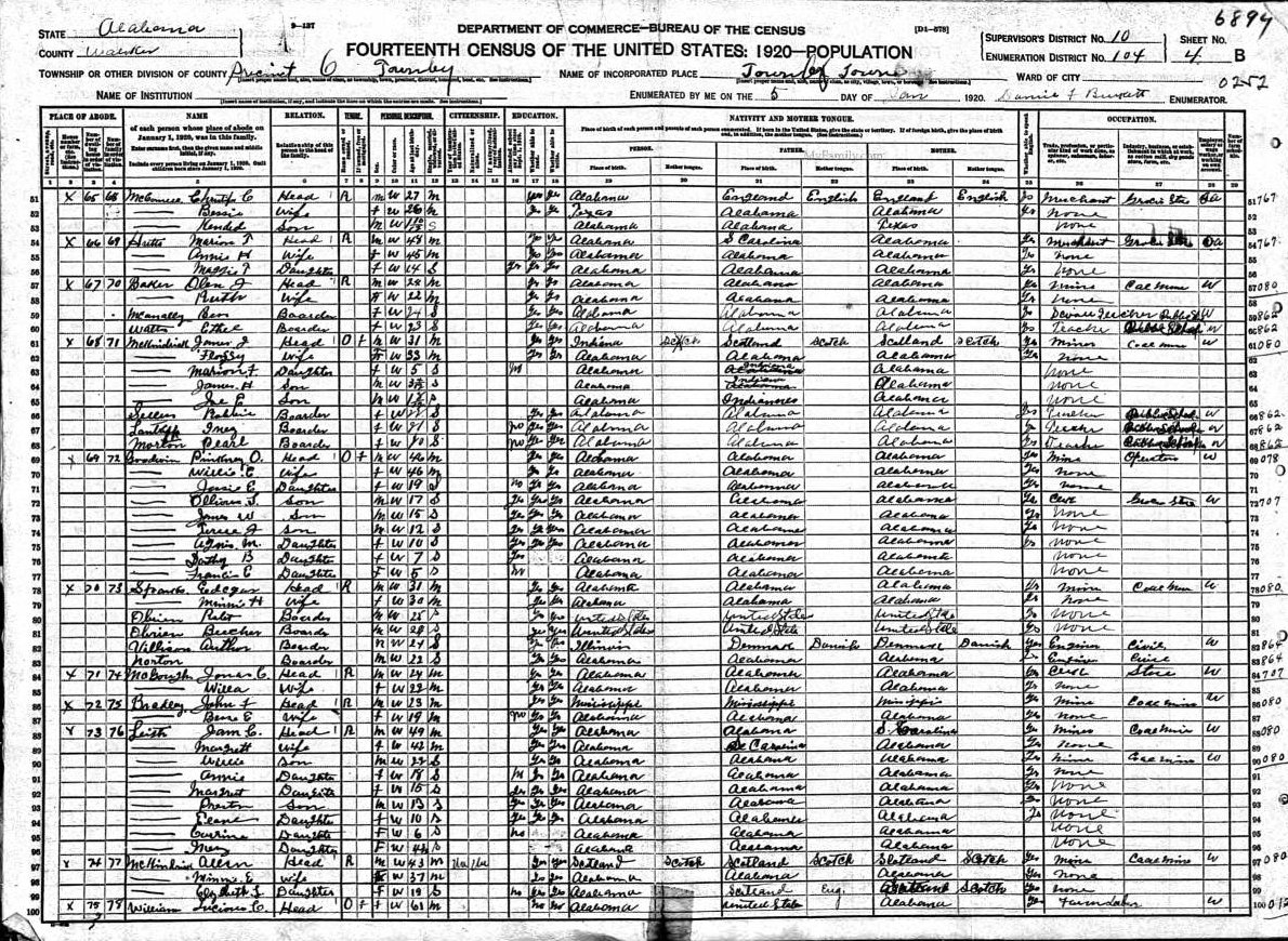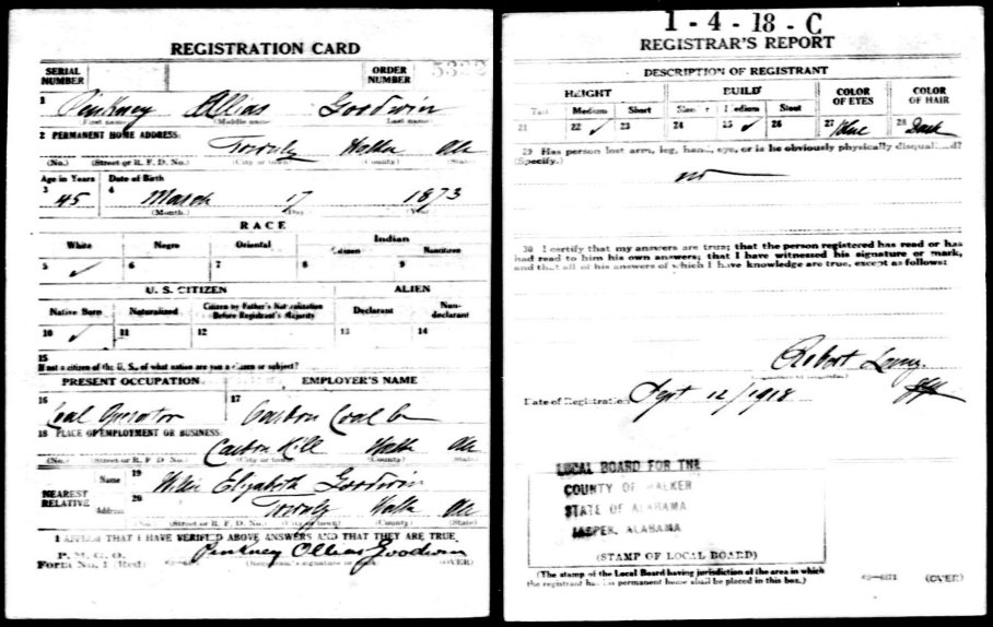 Pinkney Ollious GOODWIN Born: 17 March 1873 at: Alabama Married: Abt 1893 at: Census: 1900 at: Precient 6, Jefferson Co., AL (Census Image) Census: 1910 at: Precient 13, Walker Co., AL (Census Image page one Page 2) Census: 1920 at: Townley, Walker Co., AL (Census Image) Military: 12 Sept 1918 at: Townley, Walker co., AL (WWI Draft Card Image) Census: 1930 at: Precient 6, Jefferson Co., AL (Census Image) Died: 19 Jan 1959 at: Jefferson Co., AL Father: Pinkney E. GOODWIN Mother: Martha Ann NAIL