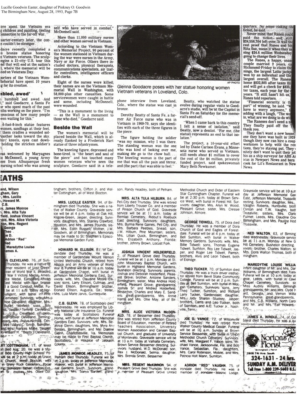 Lucille Ollie GOODWIN Born: Bet 1896-99 at: Alabama Married: Bet 1917 - 1920 at: Died: 23 Aug 1993 at: Birmingham, Jefferson Co., AL Obit: The Birmingham News, August 28, 1993, Page 7B Burial: Oak Hill, Kilgore-Green, Jasper, Walker Co., AL Spouses: Jack Clay EASTER