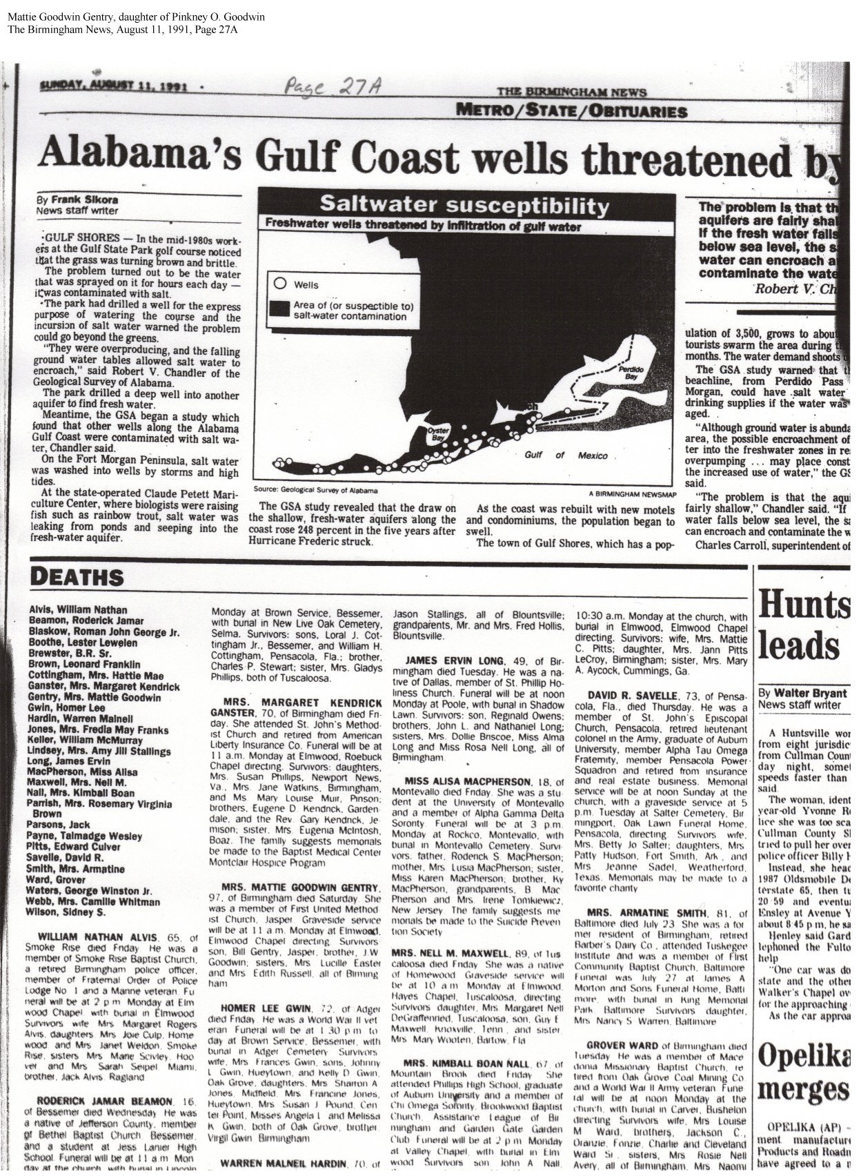 Mattie L. GOODWIN Born: Dec 1892 at: Alabama Married: at: Died: 10 Aug 1991 at: Birmingham, Jefferson Co., AL Obit: The Birmingham News, August 11, 1991, Page 27A Burial: Elmwood Cemetery, Birmingham, Jefferson Co., AL Spouses: William C. GENTRY