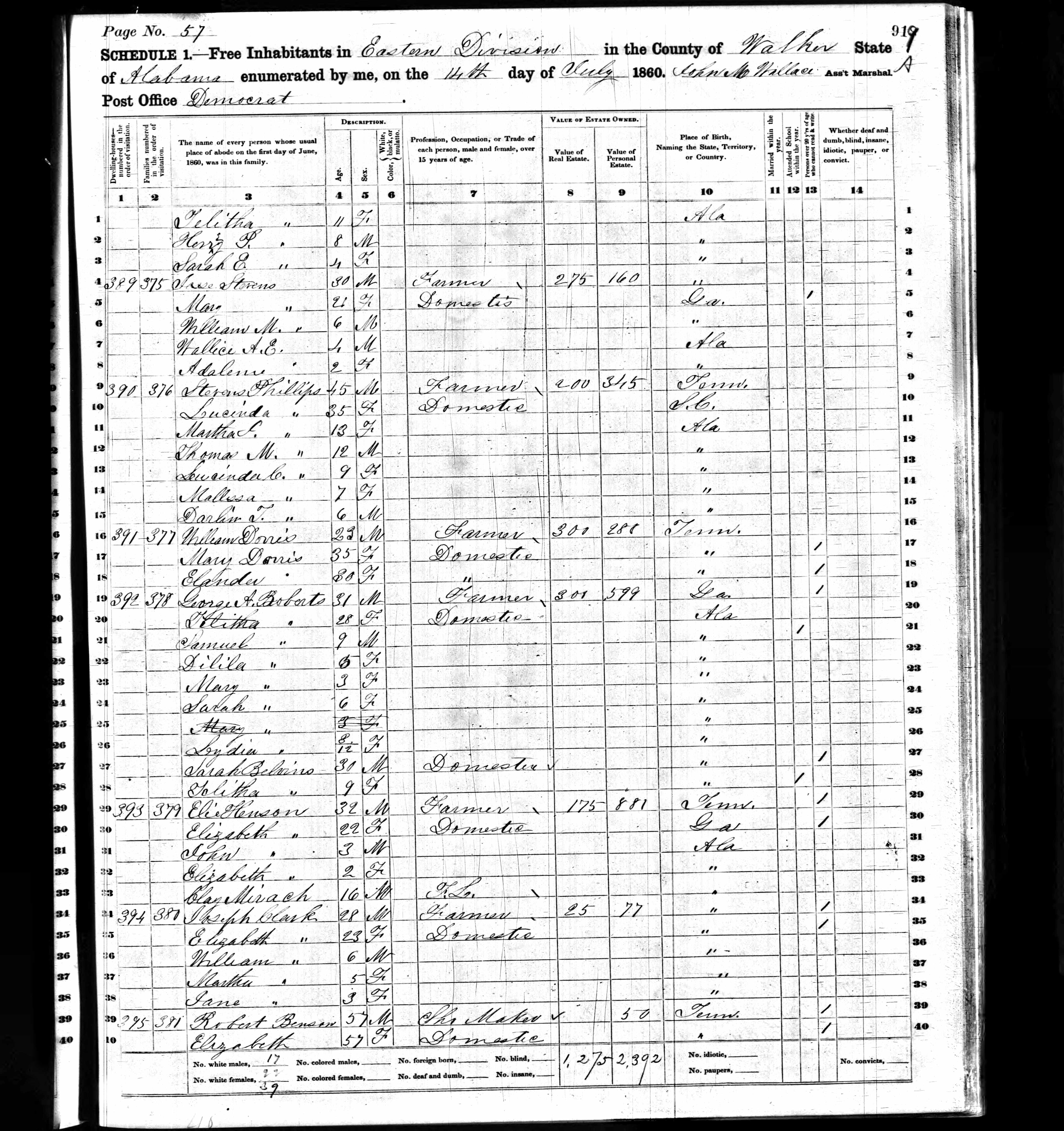 Stephen PHILLIPS Born: 1816 at: Tennessee Military: at: Alabama Militia, Indian Wars Married: 1846 at: Census: 1850 at: Walker Co., AL Census Image Census: 1860 at: Walker Co., AL Census Image Died: 1874 at: Walker Co., AL Burial: Rocky Hollow Cemetery, Destroyed Marker: Memorial marker at Phillips Freewill Cemetery, Dillworth, Walker Co., AL Father: Robert Burton PHILLIPS Mother: Abigail ADKINS