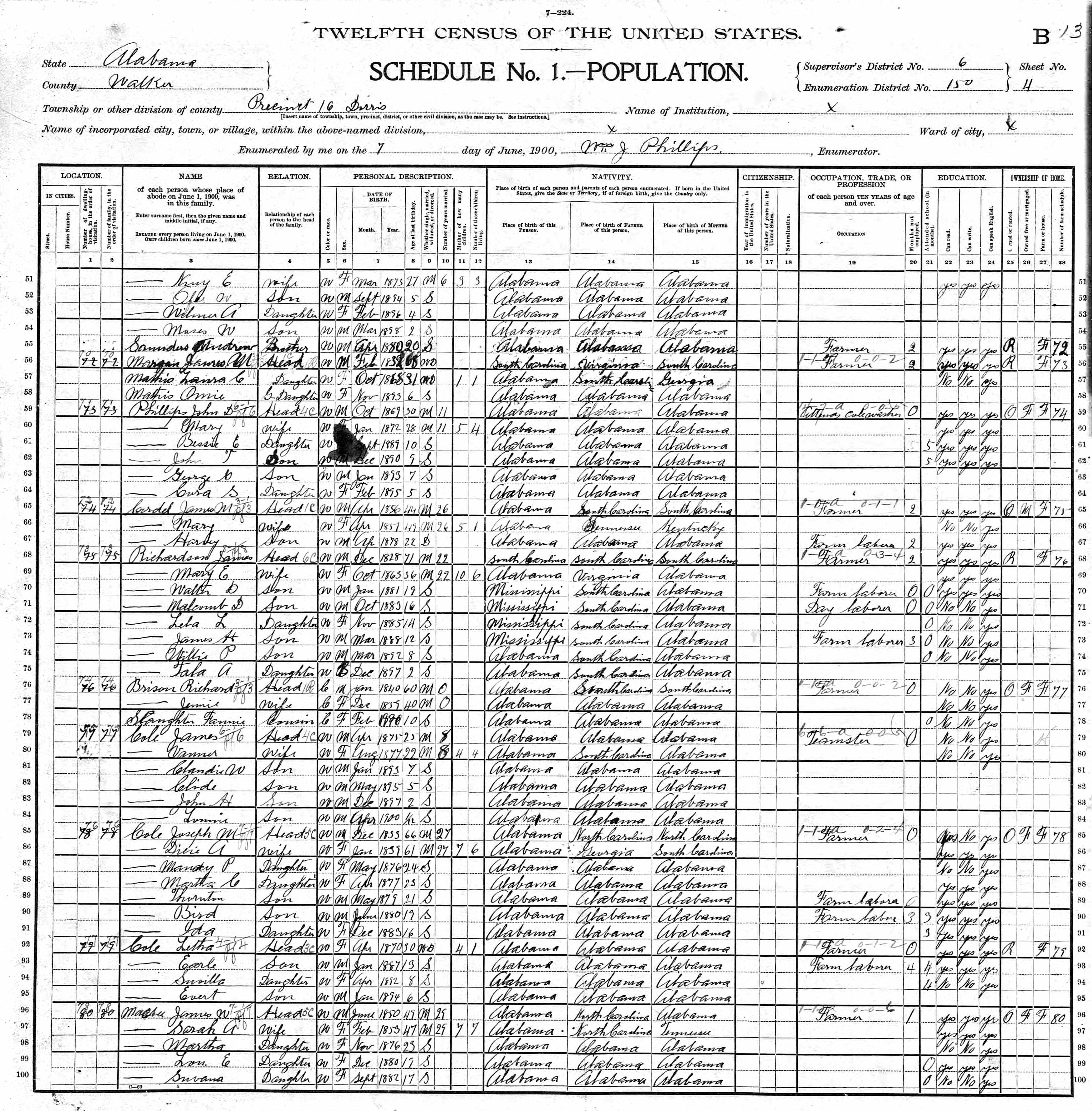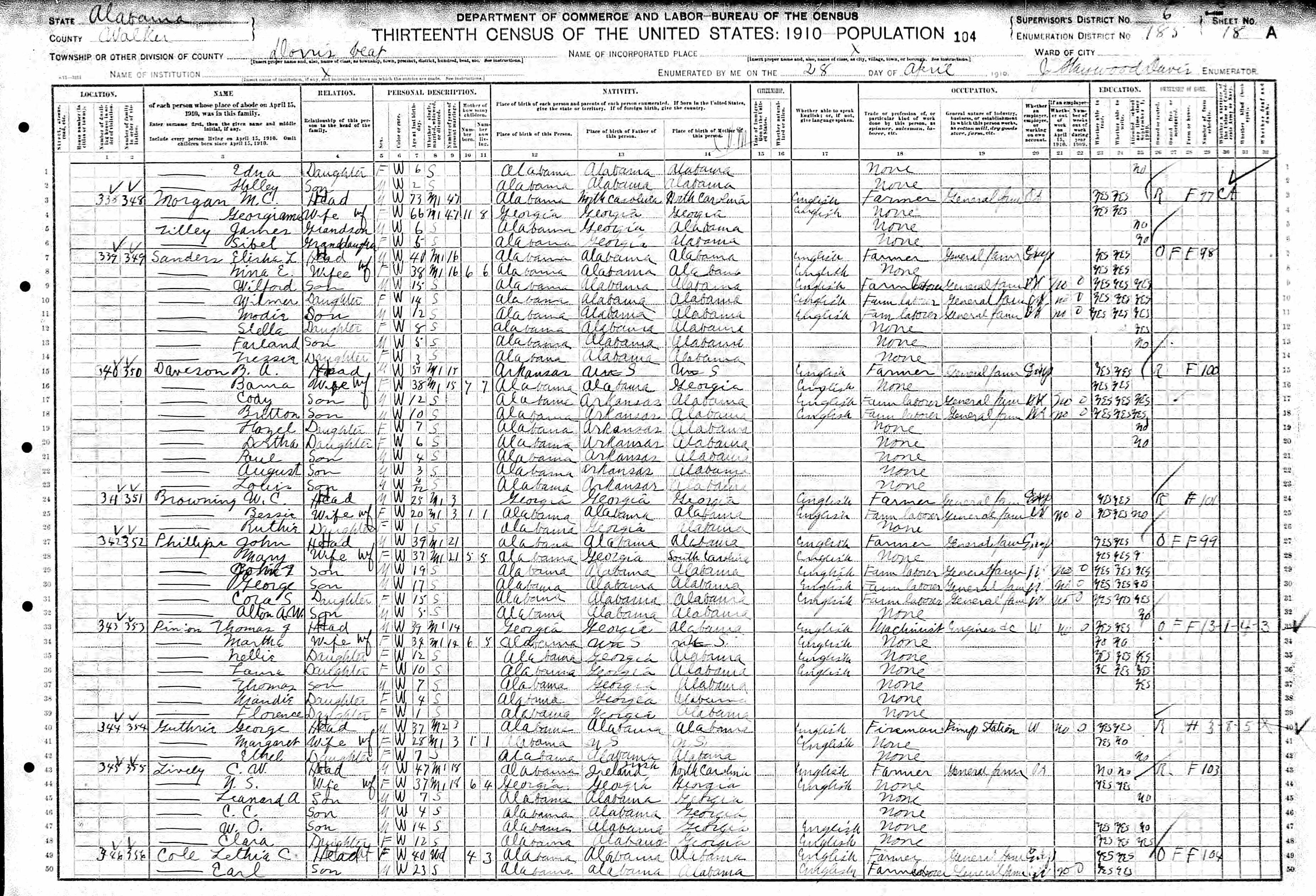 John Daniel PHILLIPS Born: 21 Oct 1869 at: Walker Co., AL Married: 20 Dec 1888 at: Walker Co., AL Census: 1900 at: Dorris, Walker Co., AL Census Image Census: 1910 at: Dorris, Walker Co., AL Census Image Census: 1930 at: Precinct 16, Walker Co., AL Census Image Census: 1940 at: Union Chapel, Walker Co., AL Census Image Died: 2 Oct 1962 at: Walker Co., AL Burial: Phillips Freewill Cemetery, Dilworth, Walker Co., AL Father: George Washington PHILLIPS Jr. Mother: Miley Elizabeth ROBINS