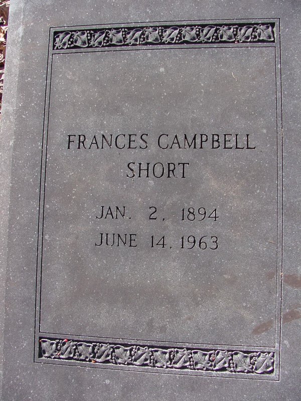 ![]() | John Campbell April 11, 1886 Feb 5, 1948 | ![]() | Fannie Reid Short Nov 30, 1930 July 7, 1933 |