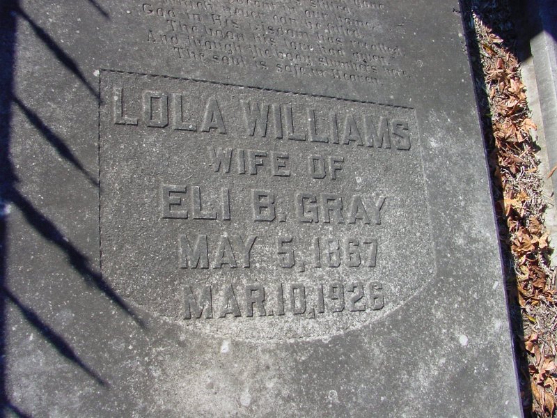 | Lola Williams Gray Wife of Eli B. Gray May 5, 1867 March 10, 1926 | ![]() | James E. Walter March 23, 1887 Feb 11, 1950 |