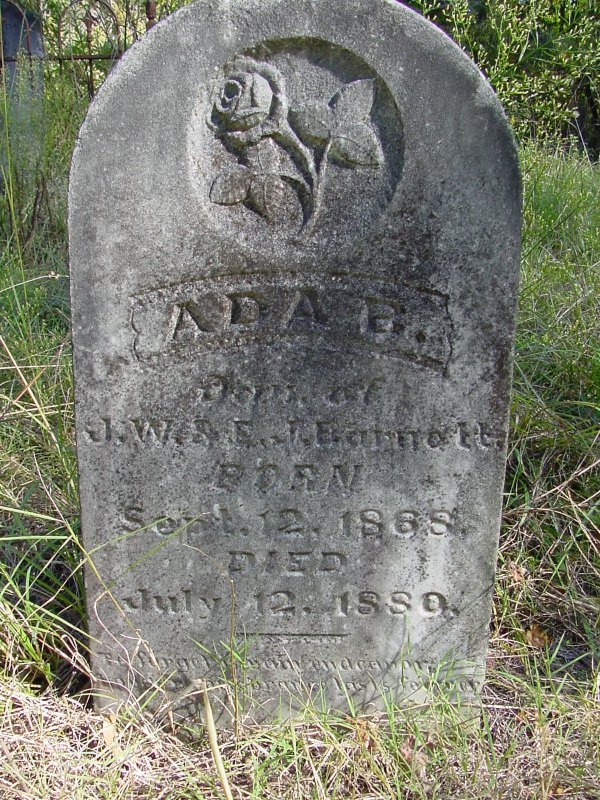 ![]() | Ada B. Barnett Daughter of J.W. and E. J. Barnett Born Sept 12, 1868 Died July 12, 1880 Note: Her father's initials are backwards and should be W. J. for William J. Barnett |