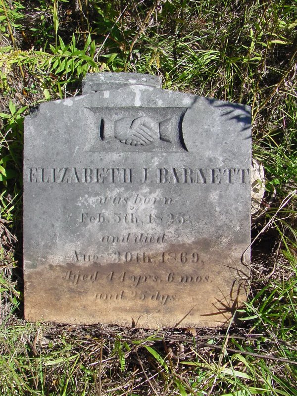 ![]() | Elizabeth J. Barnett was born Feb 5th 1825 and died Aug 30th 1869 Aged 44 yrs, 6 mos, and 25 days |