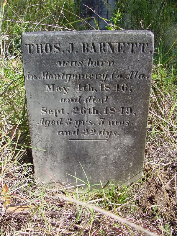 ![]() | Thos. J. Barnett was born in Montgomery Co Ala May 4th 1846 and died Sept. 26th 1849 Aged 3 yrs. 5 mos. and 22 days |