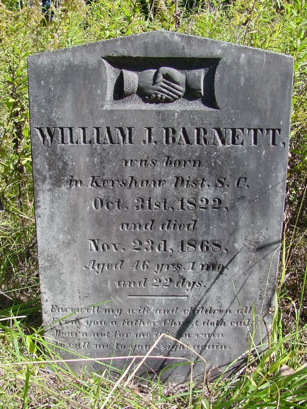 ![]() | William J. Barnett was born in Kershaw Dist, S.C. Oct 31st 1822 and died Nov 23d, 1868 Aged 46 yrs. 1 mo. and 22 days. |